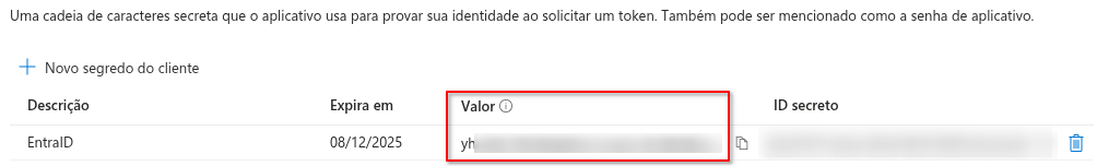 Na aba Entra ID (Azure AD), será necessário fornecer as informações do aplicativo registrado no Azure AD: