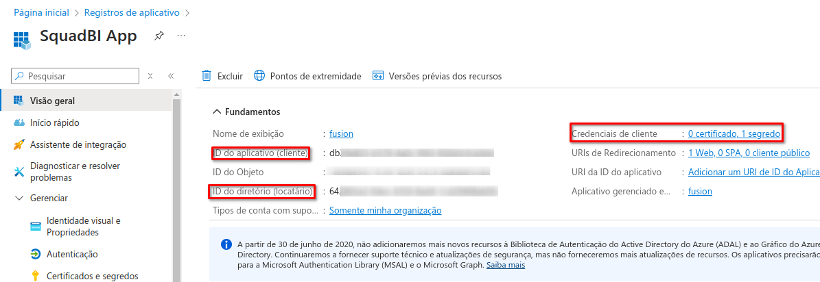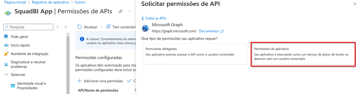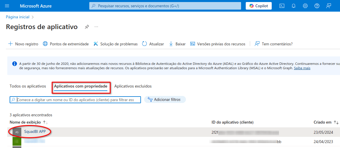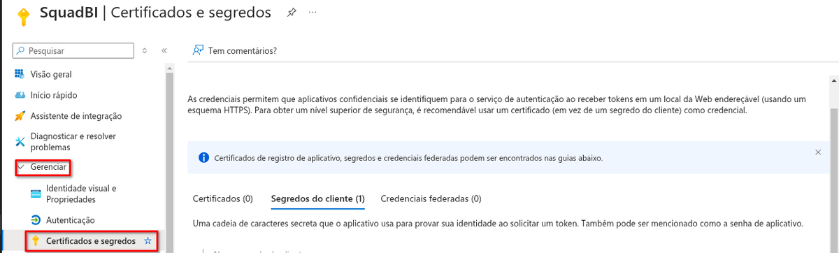 - 🔍 Selecione o aplicativo registrado no Azure AD (que foi criado para a integração com o Squad BI) para acessar as credenciais de acesso necessárias para a conexão.
