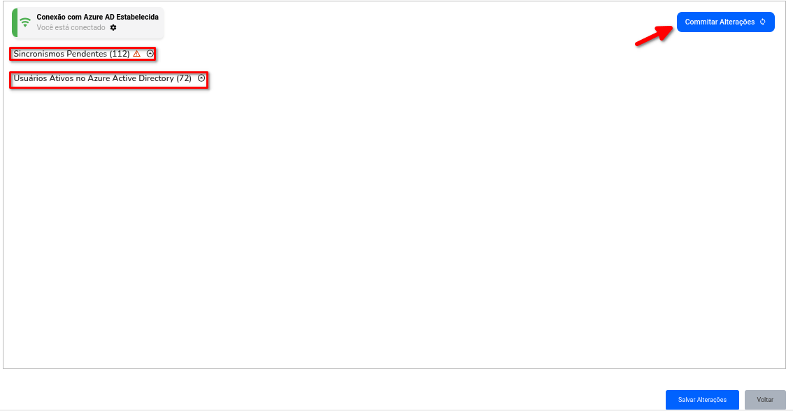 Se a conexão for bem-sucedida, a tela exibirá os usuários e grupos disponíveis no Azure AD e os Sincronismos Pendentes.