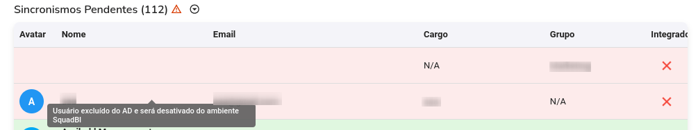 - ⚠️ Cenário comum: Caso um usuário seja excluído do Azure AD, ele aparecerá em vermelho no Squad BI até ser desativado.