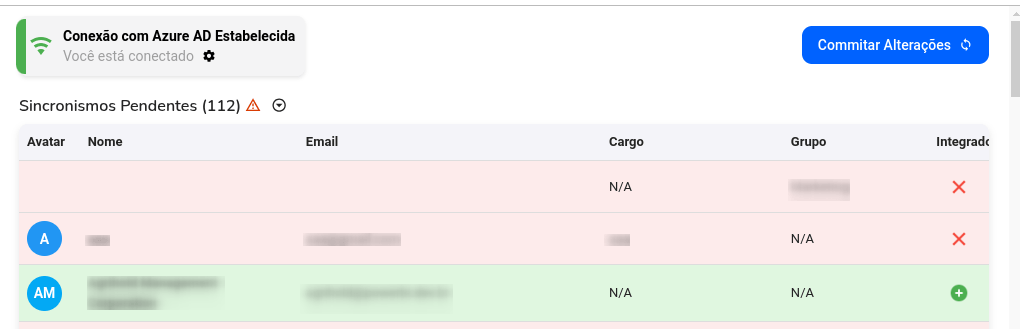 Após a integração do Entra ID (Azure AD) com o Squad BI, todos os sincronismos pendentes serão exibidos em uma lista detalhada, permitindo que você revise e finalize a importação de usuários e grupos.