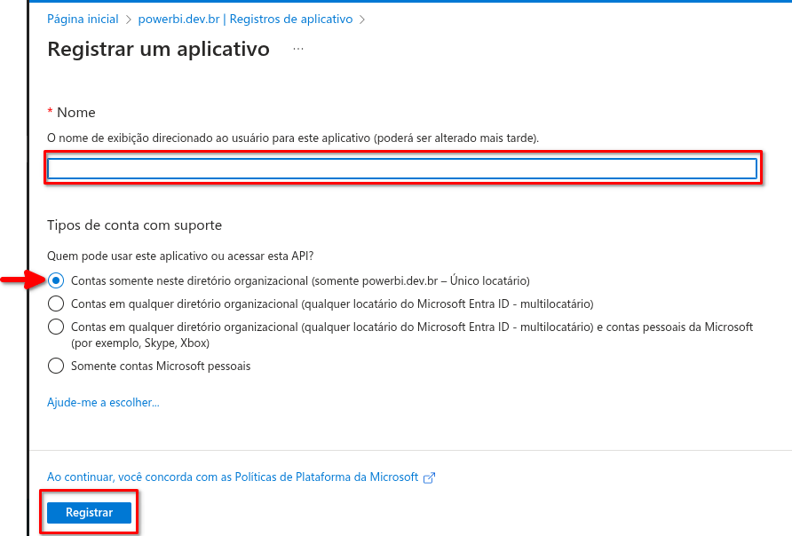 Dica: Dê um nome para a aplicação (ex.: PowerBI_Embedded_App).