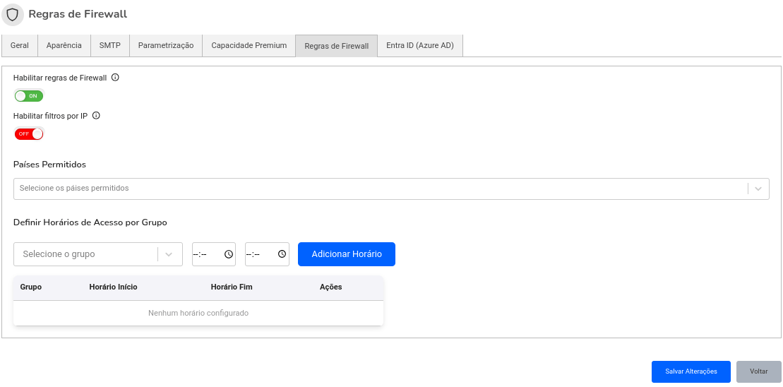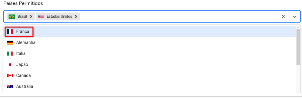 - Descrição: Esta funcionalidade permite que você escolha quais países terão acesso à plataforma. É útil para limitar o acesso a regiões geográficas específicas, aumentando a segurança.