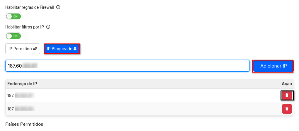 - Como adicionar: Digite o IP que deseja bloquear e clique em "Adicionar IP".