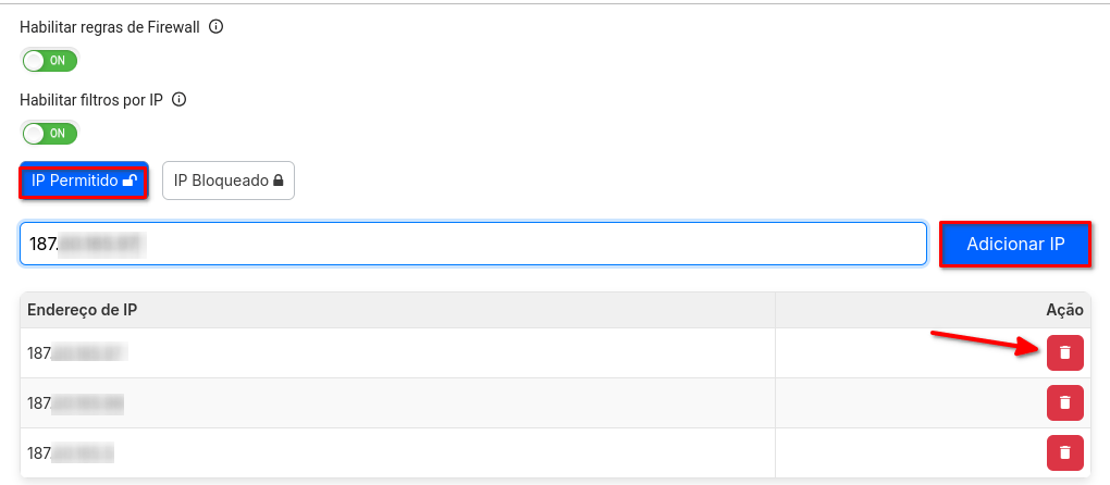 - Excluir IP: Caso deseje excluir um IP da lista, basta selecionar e clicar no ícone de "Lixeira" para remover.